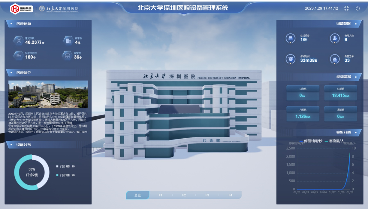 For the current hospital equipment management process is unclear, equipment maintenance process is cumbersome, energy consumption management is not fine and so on. Targeted program design, “digital twin & Internet of Things” technology on the hospital's large screen, kiosesks and other equipment for integrated and unified management. The establishment of equipment ledgers, standardization of the repair process, the collection of energy consumption information, the formation of “monitoring, management, control” as one of the intelligent equipment management platform. Let the data “visible, clear, understandable”.